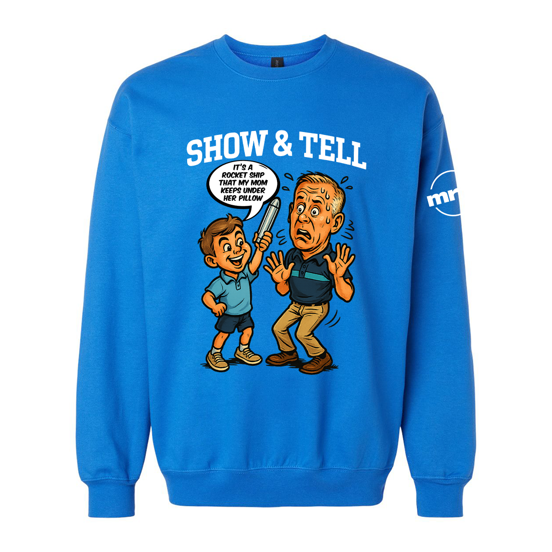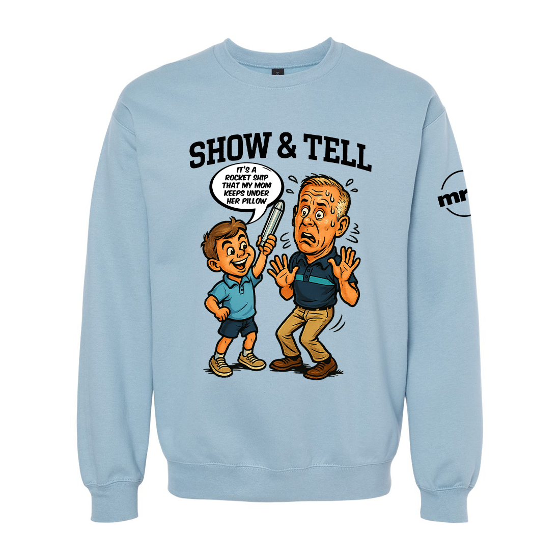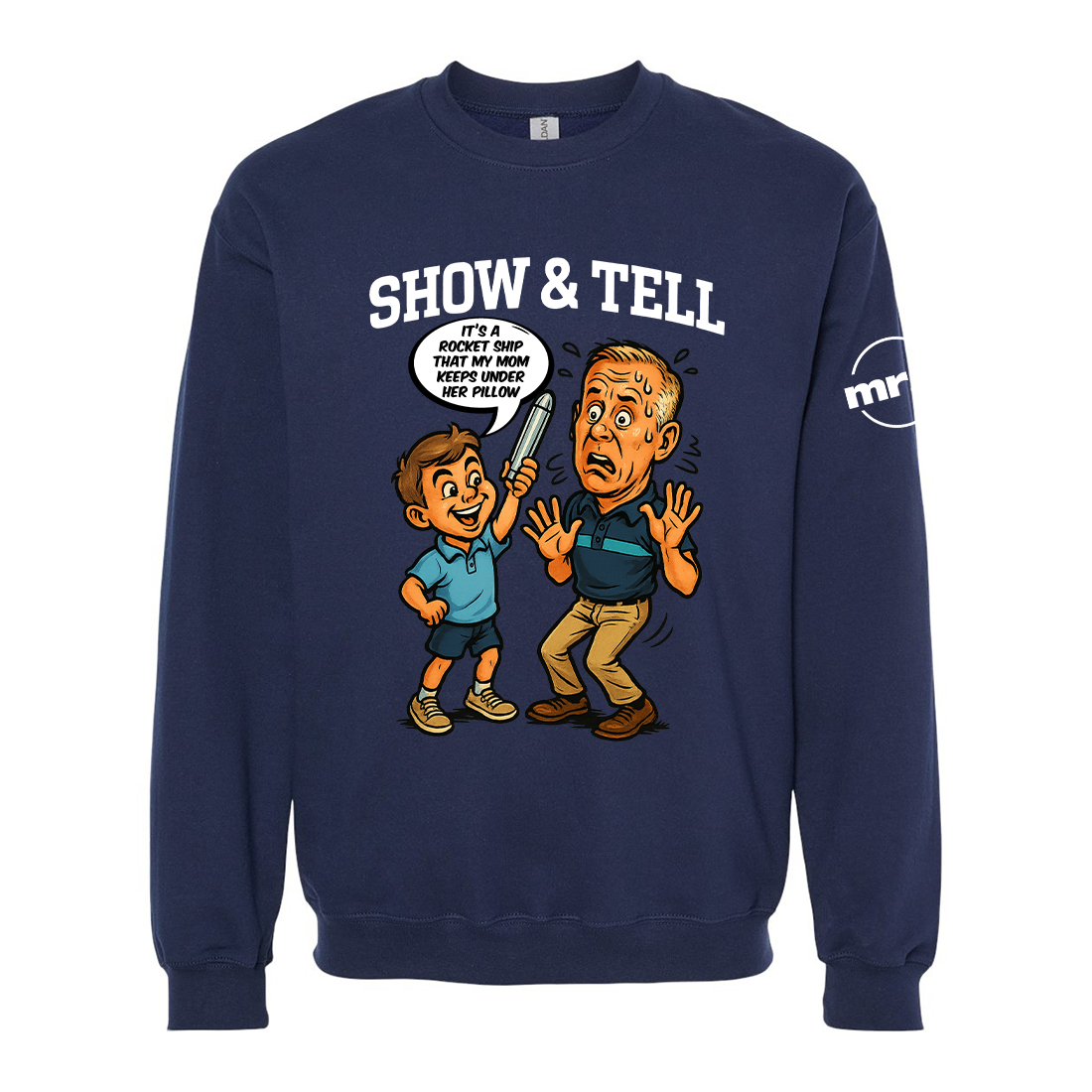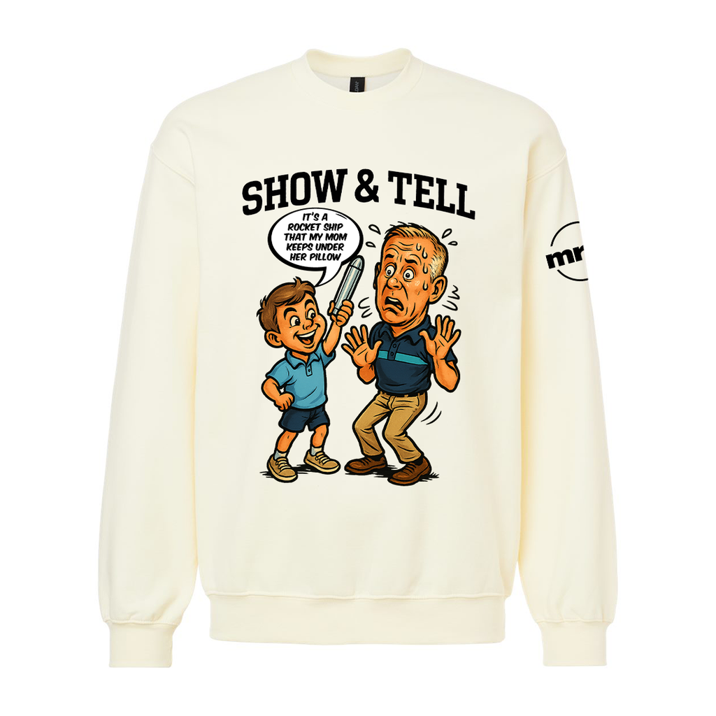 Our Show and Tell Crewneck Sweatshirt pays tribute to one of the most unforgettable classroom moments in TV history. When a student proudly brings in his mom’s “rocketship” for Show and Tell— let’s just say… it’s definitely not a rocketship.